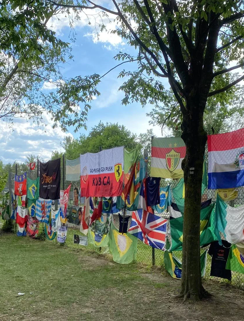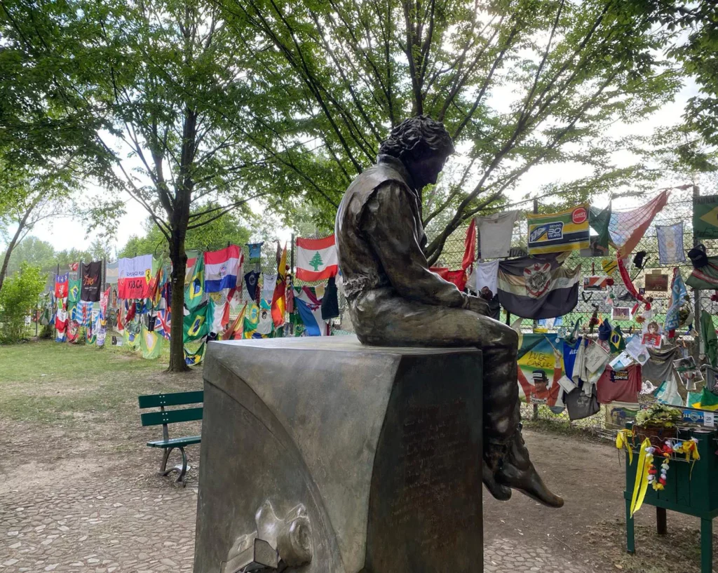 Piękny postument zamyślonego Senny stoi wśród drzew, w zacisznym parku tuż przy torze, po którym pędzą rozpędzone, hałaśliwe maszyny. Ten kontrast urzeka i potęguje wspomnienie jak bardzo wyjątkowym człowiekiem był Ayrton. Ta pamięć jest wciąż żywa a najlepszym tego dowodem jest ogrodzenie przy zakręcie Tamburello. Okryte jest ono setkami flag sztandarów i proporców kibiców Senny, którzy oddają cześć mistrzowi.